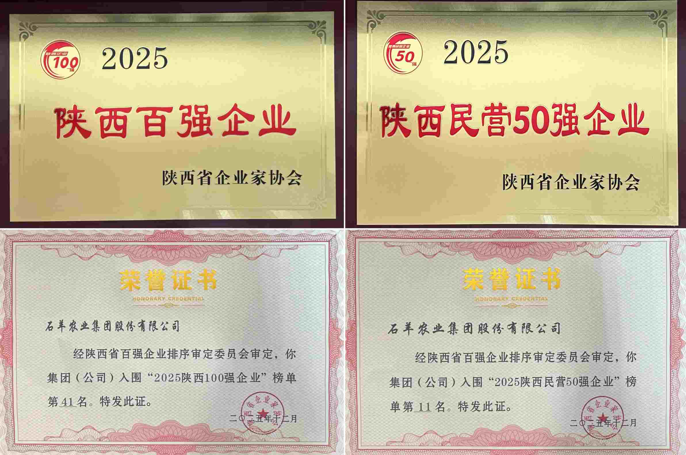12月9日,“2025陕西100强企业”和“陕西民营50强企业”名单发布,石羊集团以年收入131亿元荣登“2025陕西100强企业”榜单第41位,较2024年跃升4位!“2025陕西民营50强企业”榜单第11位,较2024年跃升1位!自2012年陕西百强企业初次评选以来,石羊集团已连续14年入围“陕西100强企业”、连续7年入围“陕西民营50强企业”。